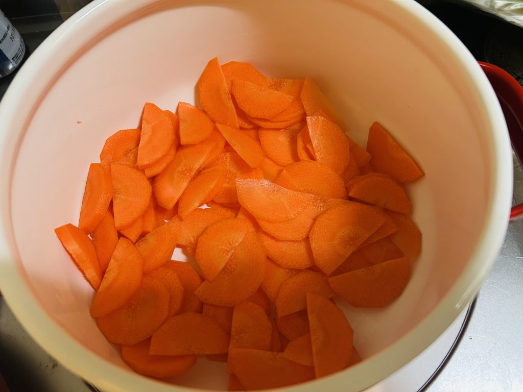 ①にんじん薄切りにして鍋にイン