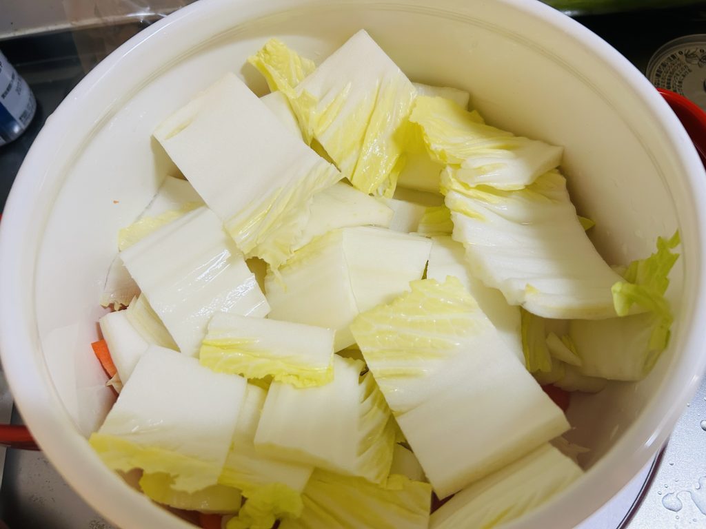 ②白菜切って、芯を鍋にイン