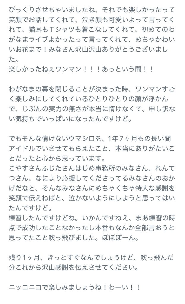 そしてアンコールの際にご報告させていただきましたが、わがなまは4/22(水)のライブをもって現体制を終了することになりました。