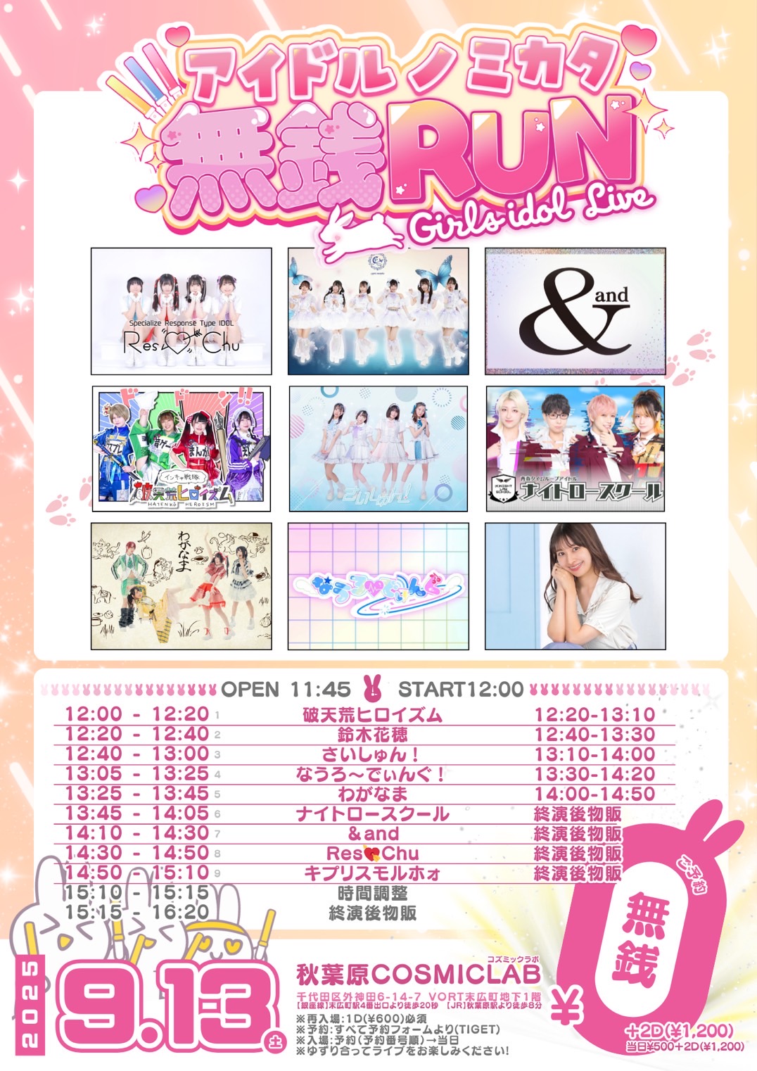 日程 2025年9月13日(土) [アイドルノミカタ]無銭RUN💰 会場 秋葉原COSMICLAB 時間 OPEN11:30/START11:45 出演時間 13:25-13:45 物販時間 14:00-14:50 料金 予約¥0+2D/当日¥500+2D(¥1,200) 予約URL https://tiget.net/events/423444