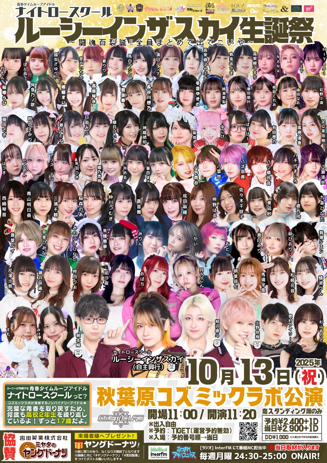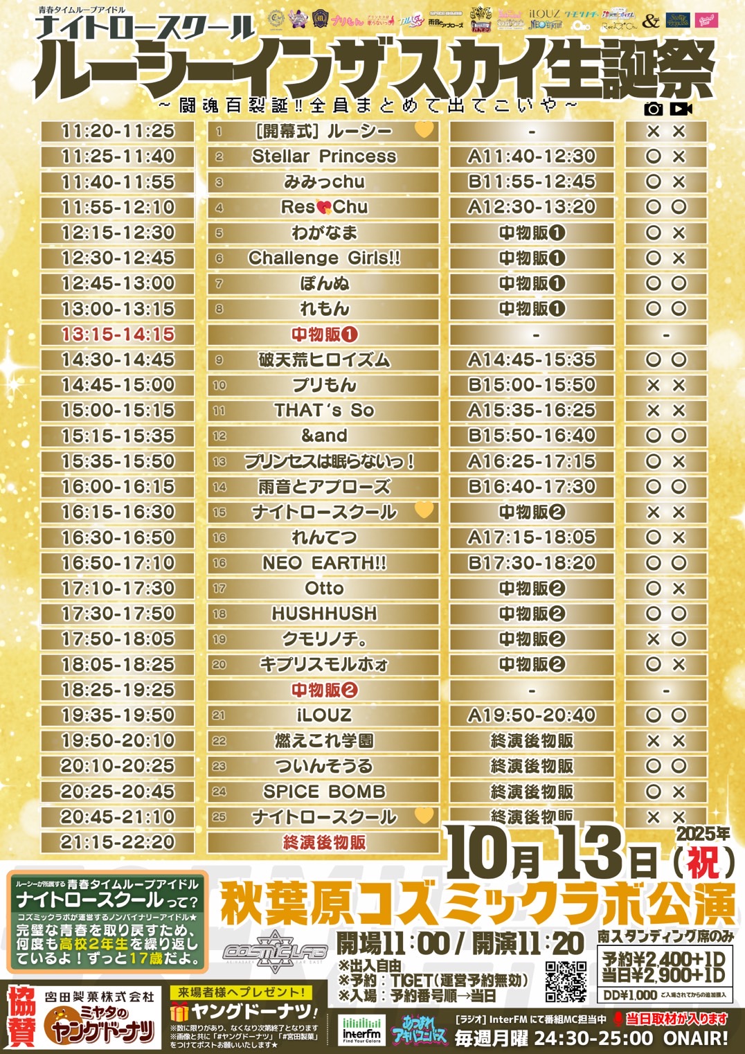 日程 2025年10月13日(祝) ルーシー生誕祭~闘魂百烈誕‼ 全員まとめて出てこいや~ 会場 秋葉原COSMICLAB 時間 OPEN11:00/START11:20 出演時間 12:15-12:30 物販時間 13:15-14:15 料金 予約¥2,400/当日+¥500/各+1D(¥600) 予約URL https://tiget.net/events/428935