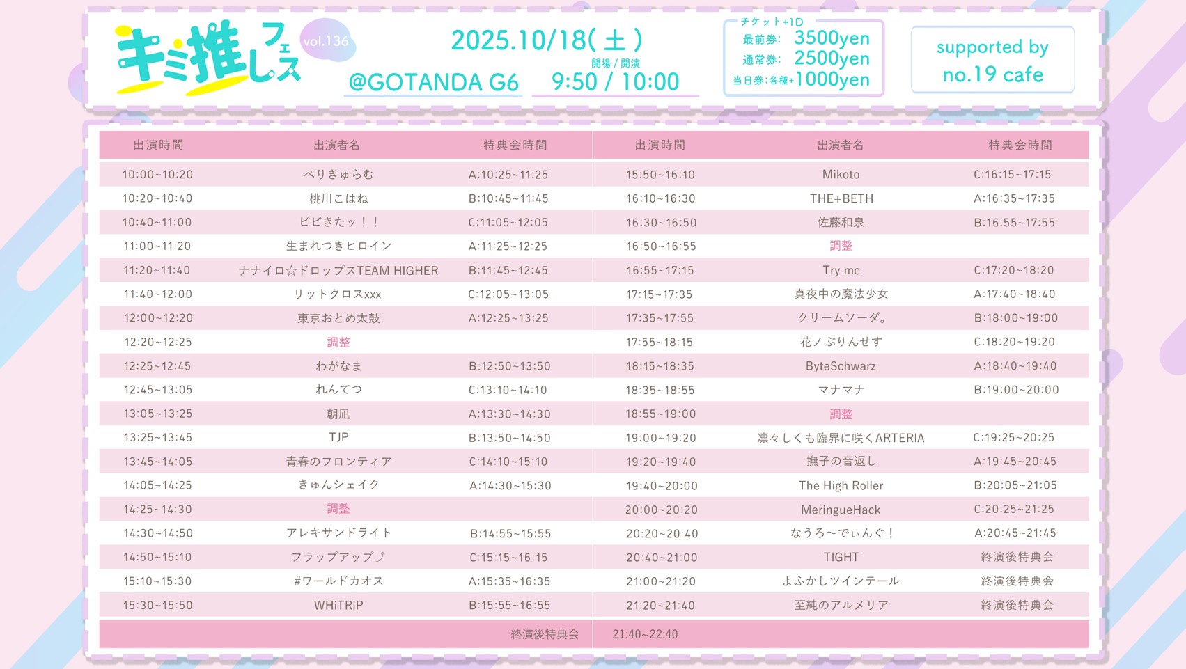 日程 2025年10月18日(土g6 会場 GOTANDA G6 時間 OPEN9:50/START10:00 出演時間 12:25₋12:45 物販時間 12:50-13:50(B) 料金 通常2,500円/前方3,500円/当日各+1,000円※各種+別途1D 予約URL paylove.org/events/1524