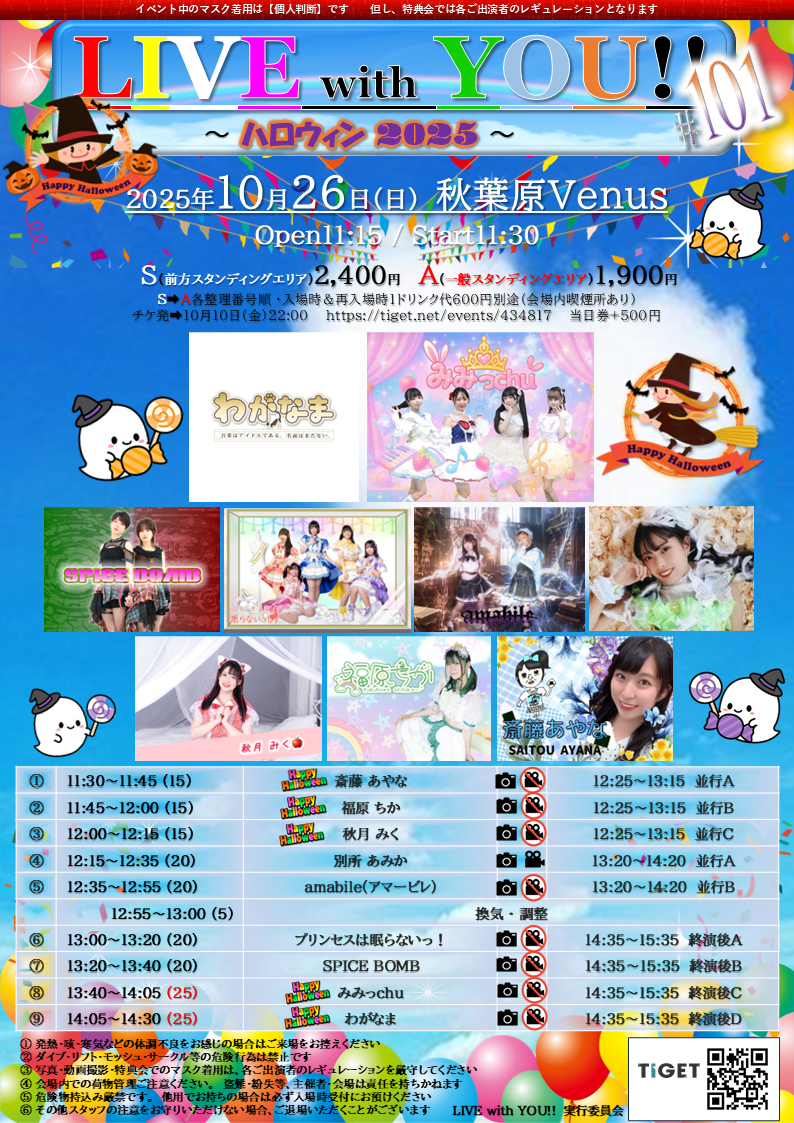 日程 2025年10月26日(日) LIVE with YOU!!~ハロウィン2025~ 会場 秋葉原Venus 時間 OPEN11:15 / START11:30 出演時間 14:05-14:30 物販時間 14:35-15:35(D) 料金 S(前方)2,400円/A(一般)1,900円/当日+500円※+各別途1D600円 予約URL https://tiget.net/events/434817