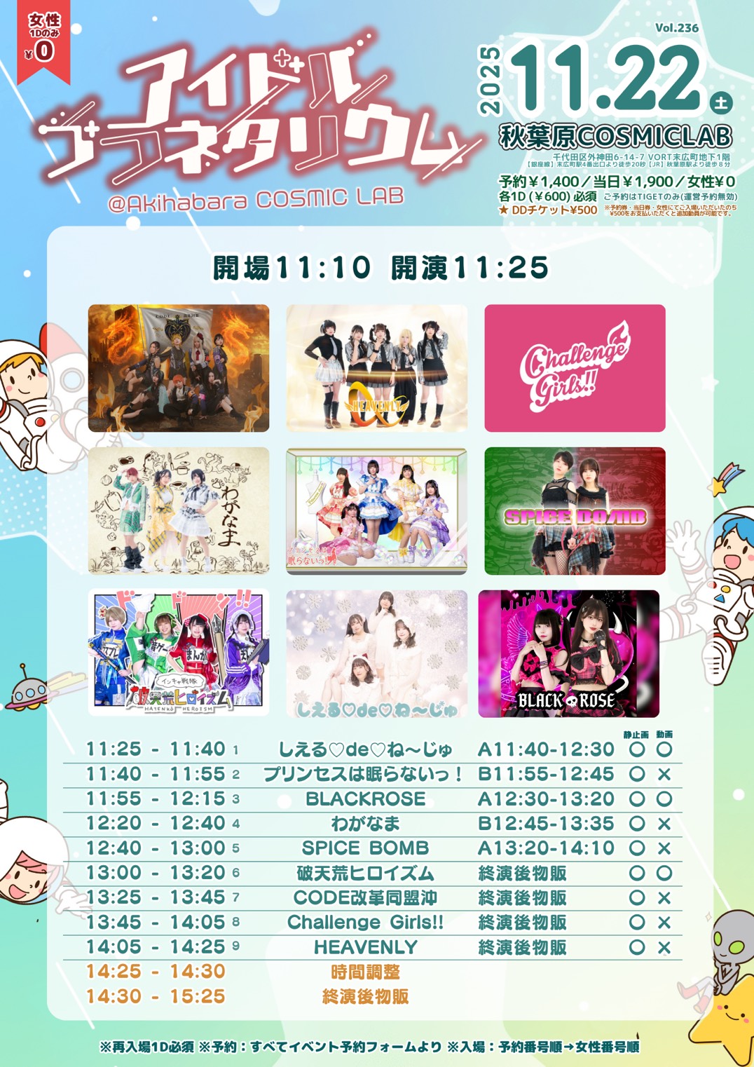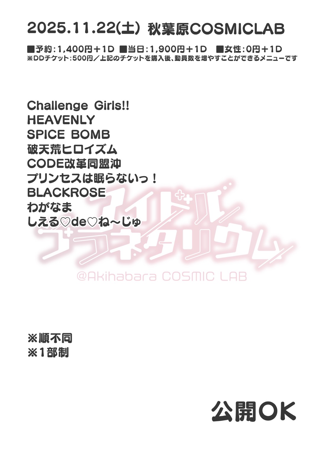 料金 予約¥1,400/女性¥0 ※+各1D (当日+¥500)、DDチケット:¥500