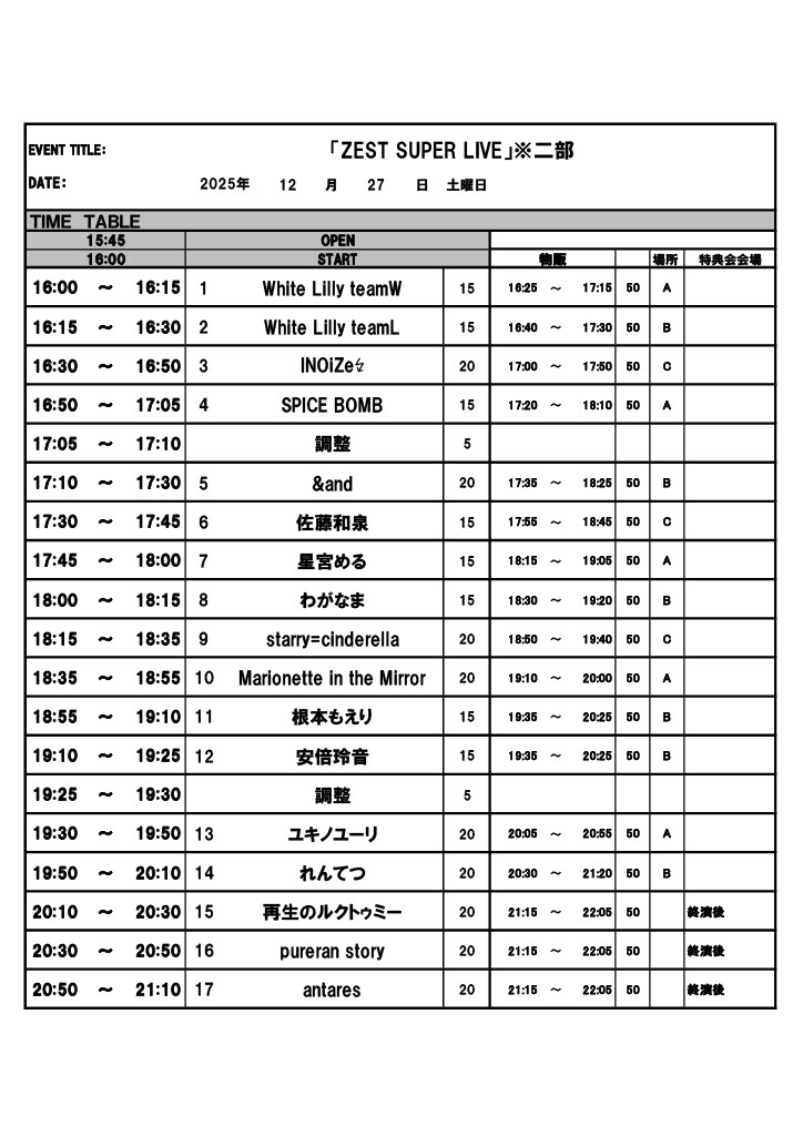 antares、ユキノユーリ、INOiZe↯、pureran story、Marionette in the Mirror、れんてつ、わがなま、再生のルクトゥミー、&and、SPICE BOMB、安倍玲音 、 根本もえり、starry=cinderella、佐藤和泉、星宮める、White Lilly teamL、White Lilly teamW、