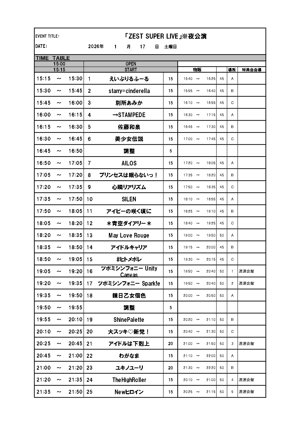 出演者 アイドルは下剋上、May Love Rouge、ツボミシンフォニー、Prhythm、ユキノユーリ、錬日乙女個色、ShinePalette、プリンセスは眠らないっ!、アイビーの咲く頃に、SILEN、AILOS、えいぷりるふーる、Newヒロイン、アイドルキャリア、美少女伝説、STAMPEDE、TheHighRoller、#ヒトメボレ、*青空ダイアリー*、わがなま、大スッキ♡新党!、心瞬リアリズム、佐藤和泉、starry=cinderella、別所あみか