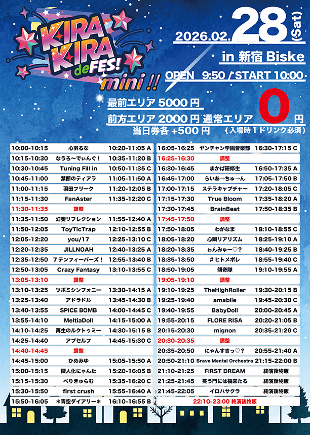 出演者 笑う門には福来たる / イロハサクラ / Brave Mental Orchestra / mignon / わがなま / FLORE RISA / ToyTicTrap / にゃんすきっ♡? / ゎんみゅー♡? / 傾奇隊 / ヤンチャン学園音楽部 / アドラドル / BrainBeat / TheHighRoller / #ヒトメボレ / 青空ダイアリー / 心瞬リアリズム / 7テンフィーバーズ! / amabile / JILLNOAH / MeltiaDoll / ぺりきゅらむ / FIRST DREAM / first crush / Tuning Fill in / BabyDoll / 羽田フリーク / Crazy Fantasy / らいあ→ちゅ→ん / なうろ〜でぃんぐ! / you/17 / 再生のルクトゥミー / 禁断のティアラ / FanAster / 心羽るな / True Bloom / ステラキャプチャー / 幻奏リフレクション / 擬人化にゃんた / まかぱ研修生 / SPICE BOMB / ひめみゆ / アプセルフ / ツボミシンフォニー
