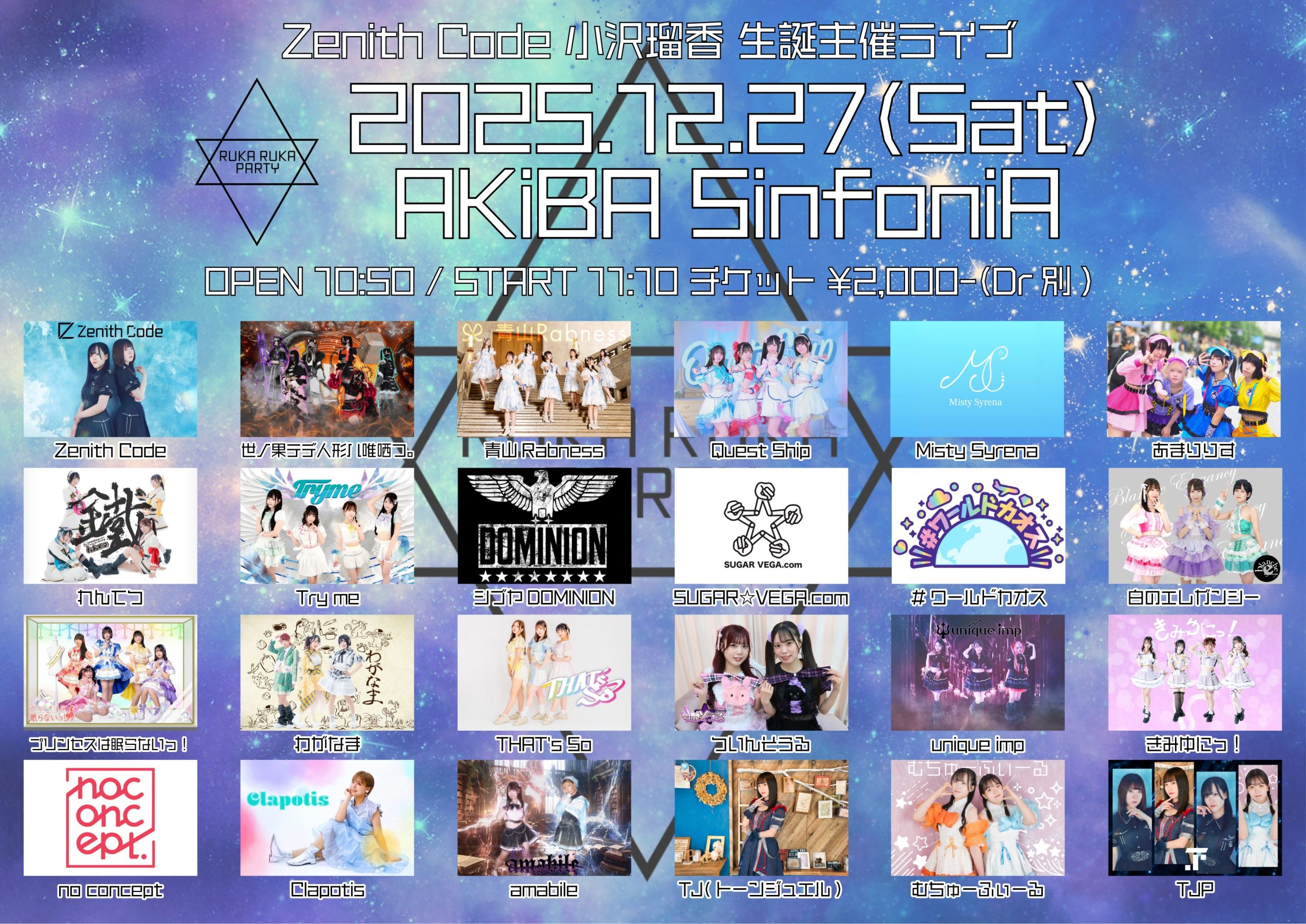 出演者 Zenith Code / 世ノ果テデ人形ハ唯哂フ。/ 青山Rabness / Quest Ship / Misty Syrena / あまりりす / れんてつ / Try me / シブヤDOMINION / SUGAR☆VEGA.com / #ワールドカオス / 白のエレガンシー / プリンセスは眠らないっ!/ わがなま THAT’s So / ついんそうる / unique imp / きみゆにっ!/ no concept / Clapotis / amabile / TJ(トーンジュエル) / むちゅーふぃーる / TJP